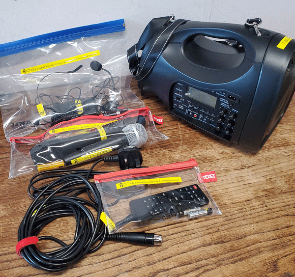 This PA comes in a backpack and has 65W output; a rechargeable internal battery; wireless hand-held and headset/clip mics and a condensing mic with a lead. You can use it for speech or to play music from a range of inputs, including Bluetooth